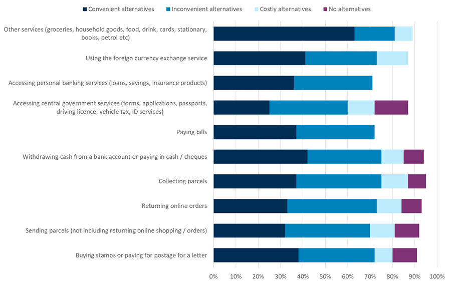 For example, while the use of cash by consumers has declined over a number of years and this trend is predicted to continue, just over 3 million people (approx. 6% of the UK population) use cash to pay for all or most things in 2022.[3] Post Offices make up more than 65% of all branch-based cash access points in the UK.[4] More broadly, we also recognise that the Post Office network can play an important role in supporting local high streets, and the associated consumer benefits of this.