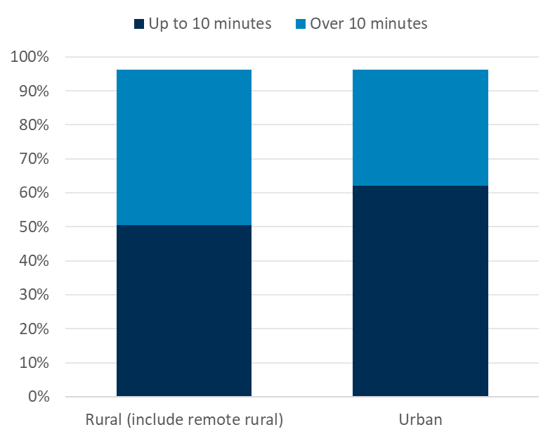 Rural consumers are more likely to travel over 10 minutes to get to the Post Office branch they use the most.