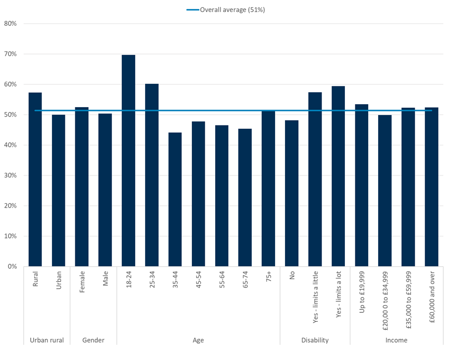 - Those living in rural areas (46%) are statistically significantly more likely to say it takes over 10 minutes to get to their most used Post Office branch, compared to those in urban areas (34%)